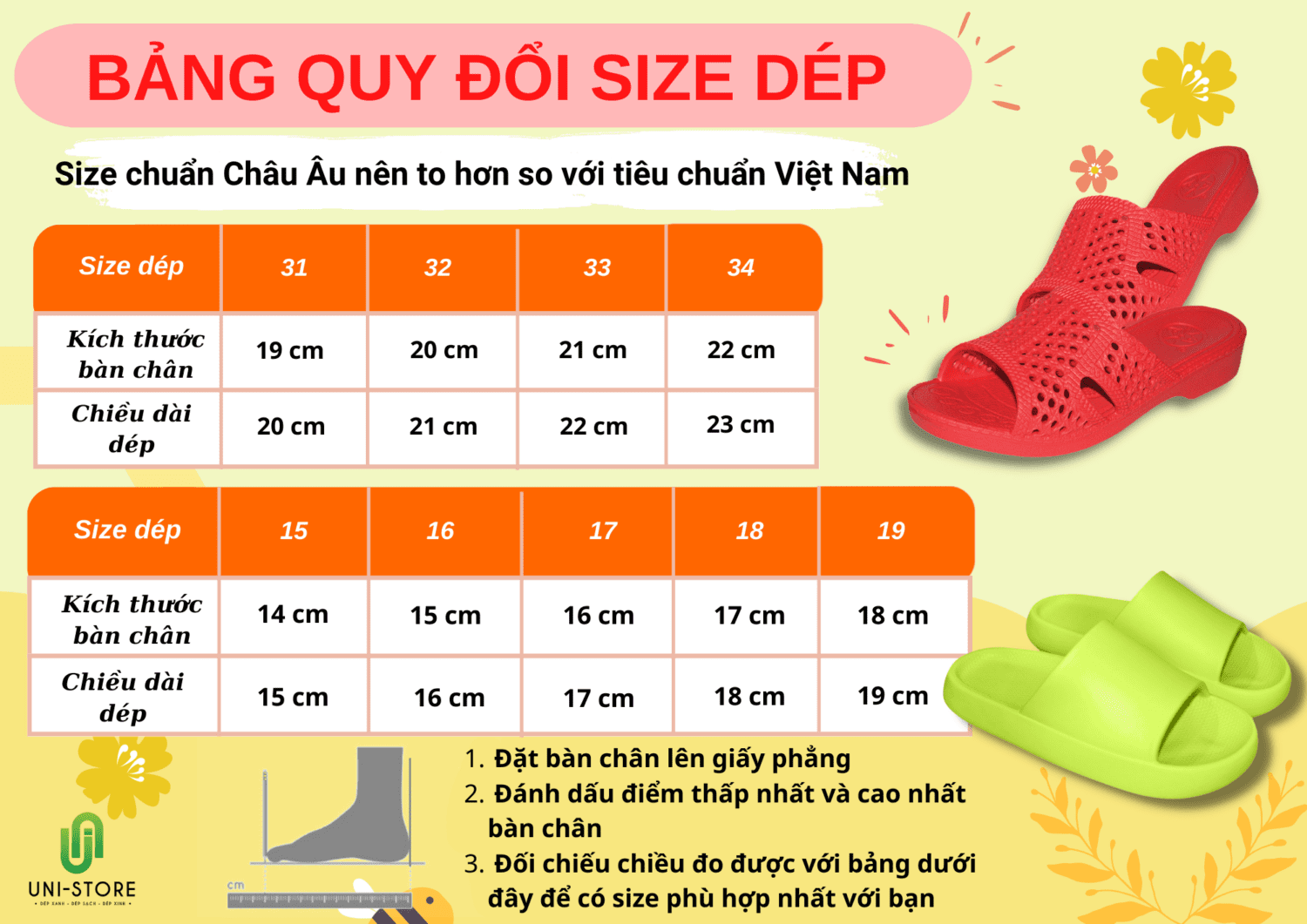 Với thiết kế nhẹ nhàng cùng chất liệu EVA, trọng lượng đôi dép chỉ từ 222 gram, Dép Tổ Ong sẽ là người bạn đồng hành lý tưởng cho mọi hoạt động, giúp bạn có thể di chuyển một cách linh hoạt, đồng thời vẫn mang lại cảm giác cực kỳ êm ái thoải mái cho đôi chân của bạn. Dép xuất khẩu Châu Âu nên size rộng hơn size bình thường cỡ 2 size - Quý khách tham khảo bảng size sau: