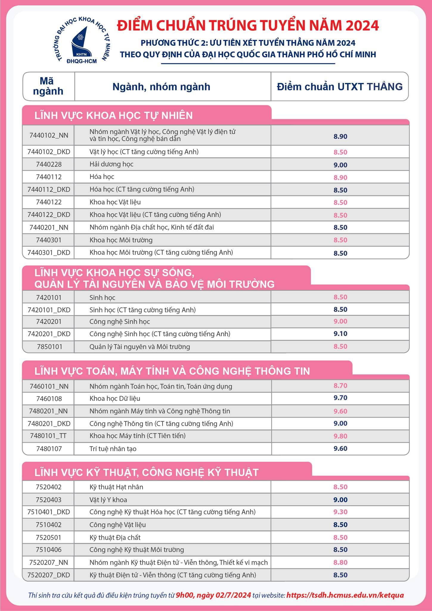 - Từ 09 giờ 00, ngày 02/7/2024: Thí sinh tra cứu danh sách đủ điều kiện trúng tuyển tại địa chỉ trang web: https://tsdh.hcmus.edu.vn/ketqua