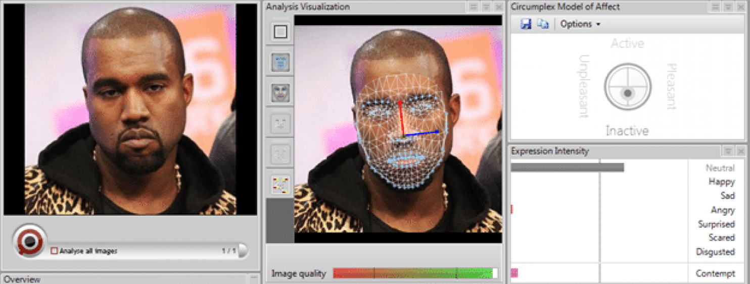 Hai nhà tâm lý học Jason Rogers và Abbe Macbeth đã sử dụng phần mềm FaceReader để quét hơn 10 nghìn bức chân dung, xác định 500 tọa độ trên khuôn mặt để xem các điểm này sẽ thay đổi như thế nào khi chúng ta có các cảm xúc khác nhau như vui mừng, buồn bã, chán nản, giận dữ. Và ở các khuôn mặt không-cảm-xúc, thì 97% số điểm sẽ ở trạng thái bình thường, chỉ có 3% biểu lộ cảm xúc đặc biệt như buồn một tẹo, vui một chút.