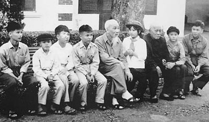 Các thiếu niên dũng sĩ miền Nam được chụp hình với Bác Hồ và Bác Tôn. Ảnh tư liệu Sự kiện quốc tế